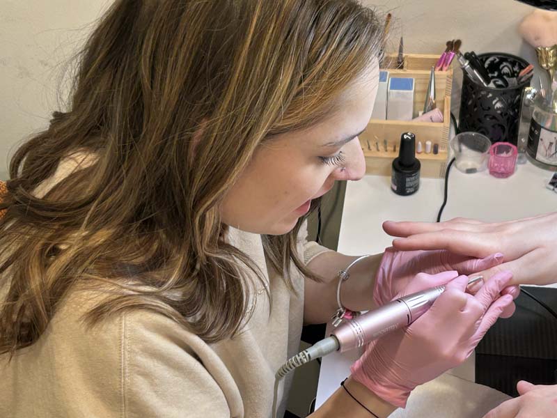 - Nail shaping and filing: We soak your hands in warm water to soften dead skin cells, then file your nails to your desired shape